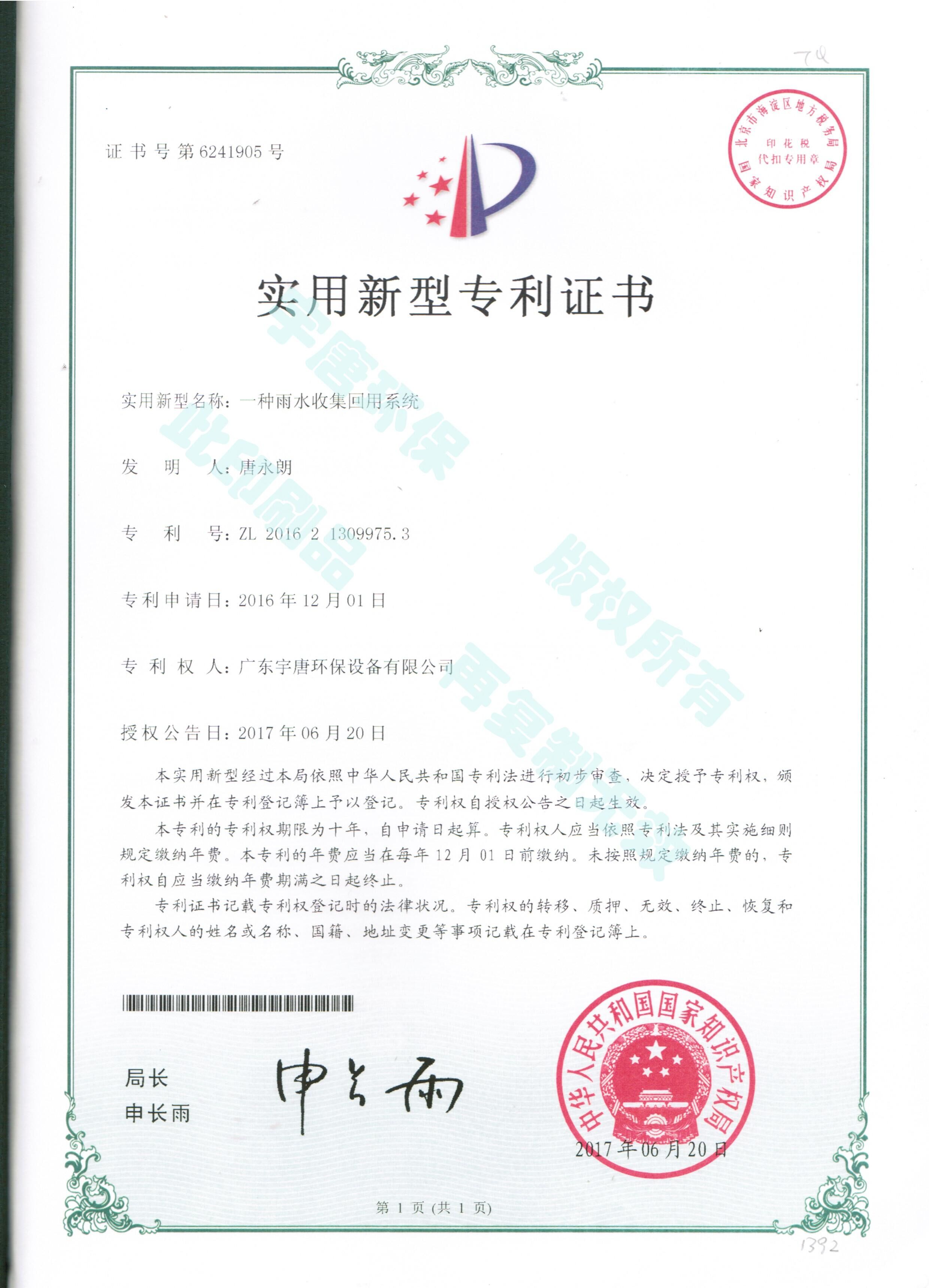 一種雨水收集回用系統(tǒng)實(shí)用新型專利證書(shū)